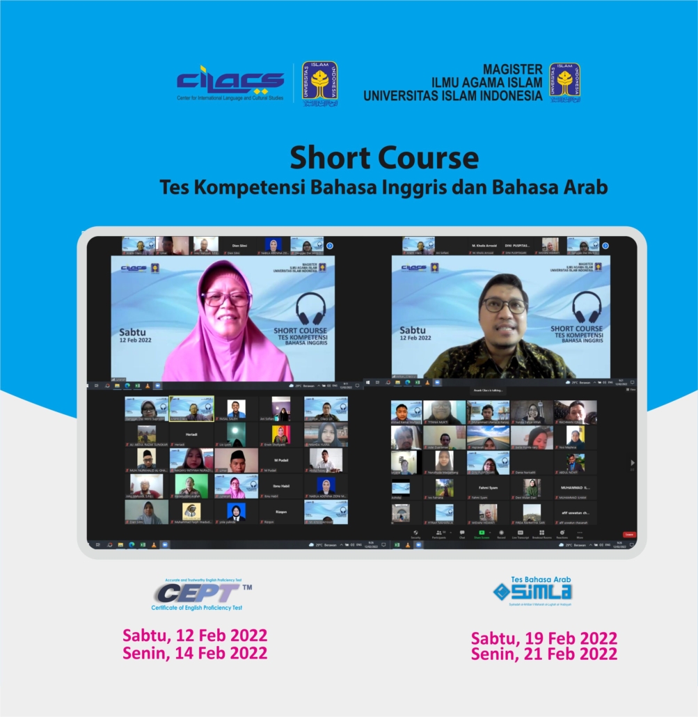 Sabtu 12 Februari 2022, untuk yang kesekiankalinya seperti pada periode sebelumnya Program Studi Magister ilmu Agama Islam Fakultas Ilmu Agama Islam Universitas Islam Indonesia (MIAI FIAI UII) kembali mempercayakan kembali kerja sama pelatihan bahasa Inggris kepada Center for International Language and Cultural Studies (Cilacs UII). Paket program Short Course tas bahasa Inggris dan Bahasa Arab serta CEPT dan SIMLA bagi mahasiswa Pascasarjana S2 dan S3 angkatan 2021/2022.