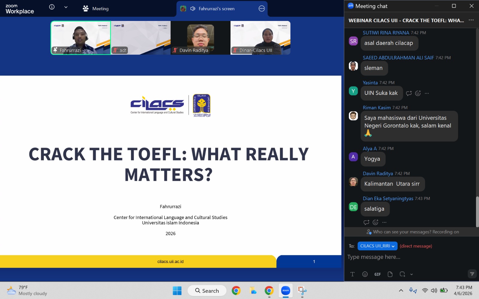 Rombongan dipimpin oleh Rizka Rivensky dan didampingi Elfiadi, disambut langsung oleh Kepala CILACS UII, Rr. Ratna Roostika, SE., MAC., Ph.D., yang diwakili oleh Aditya Suci (Kepala Departemen Pemasaran), Suprihatin (Kepala Departemen Akademik), serta Sudharmanto (Kepala Departemen Layanan Tes).