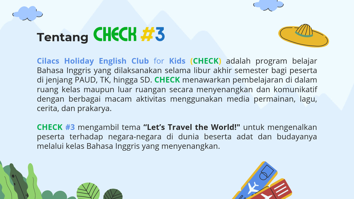Cilacs Holiday English Club for Kids (CHECK) diharapkan dapat memberikan manfaat kepada peserta:
