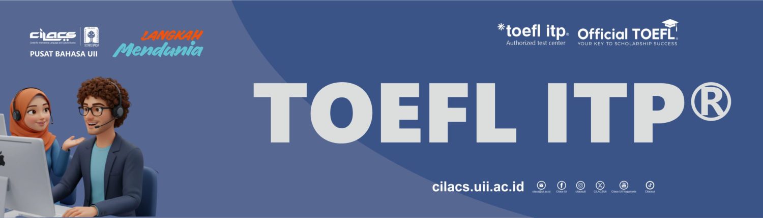 TOEFL ITP® (Test of English as a Foreign Language – Institutional Testing Program) merupakan salah satu tes alat ukur kompetensi bahasa Inggris yang diterbitkan oleh ETS (Educational Testing Service), sebuah lembaga penyedia tes kompetensi bahasa Inggris yang berpusat di Princenton, Amerika Serikat. Cilacs UII secara resmi bekerjasama dalam penyelenggaraan TOEFL ITP® melalui perwakilan ETS di Jakarta yaitu IIEF (International Indonesian Education Foundation), Jakarta. Sertifikat TOEFL ITP® yang diterbitkan adalah resmi dari ETS.